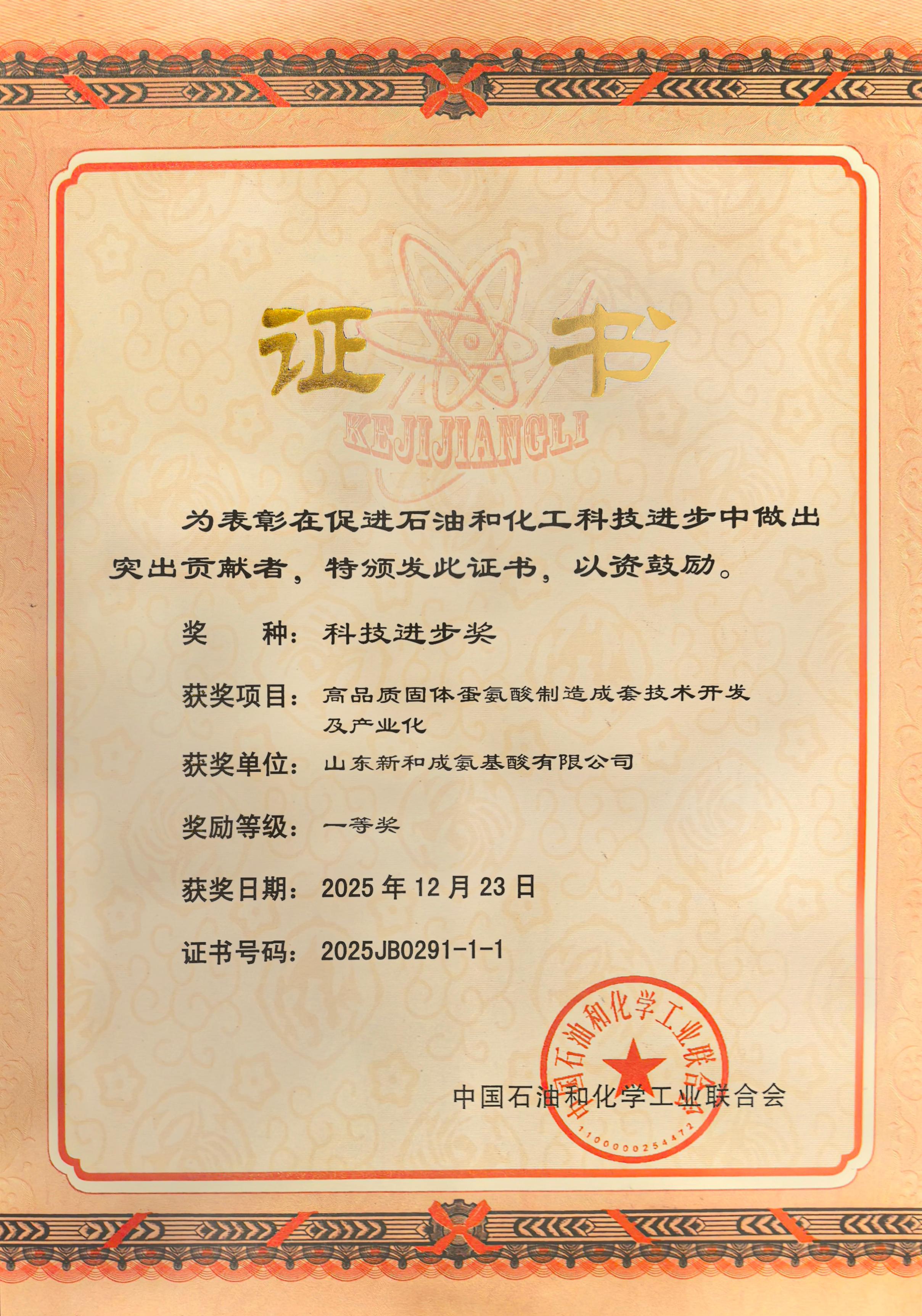 On December 24, the Science and Technology Awards Conference of the China Petroleum and Chemical Industry Federation (CPCIF) was held in Beijing, where a number of leading enterprises and individuals were recognized for outstanding achievements in scientific and technological innovation. NHU’s project, “Development and Industrialization of Integrated Manufacturing Technologies for High-Quality Solid Methionine” was awarded the First Prize of the Science and Technology Progress Award in recognition of its significant technological breakthroughs and industrial value. This honor once again underscores NHU’s strong innovation capabilities and achievements in industrialization, as recognized by a national-level industry authority. Mr. Chen Zhirong, Honorary Chief Engineer of NHU, accepted the award on behalf of the company.